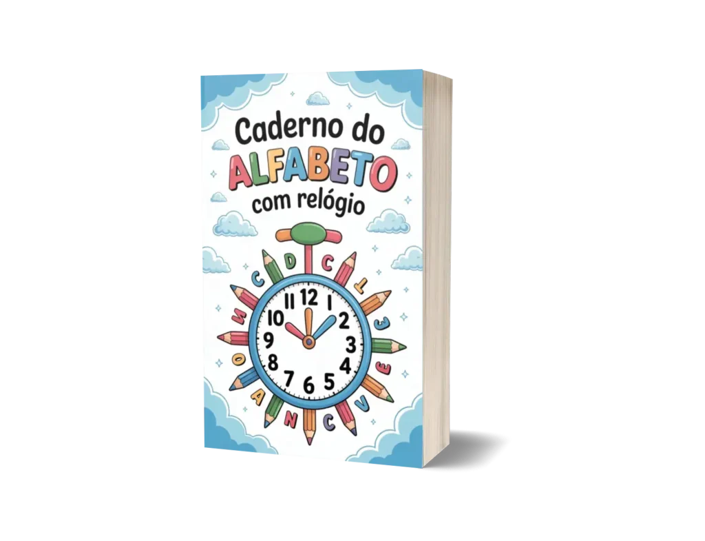 Caderno interativo que ensina as letras do alfabeto junto a um relógio, promovendo a leitura e noções de tempo de forma lúdica.