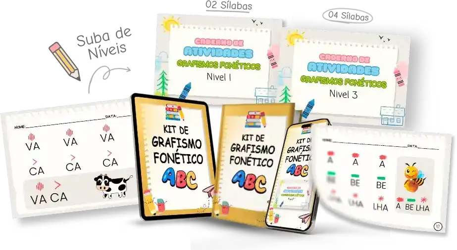 Com o Kit de Grafismo Fonético, baseado no método americano de alfabetização, seu filho aprende a ler até 5x mais rápido — de forma divertida, simples e eficaz, direto de casa!